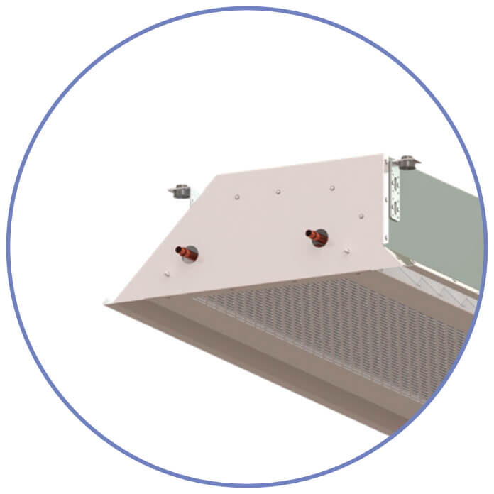 Die Zuluft wird über präzise Düsen in das Gerät eingeblasen. Dabei entsteht ein sogenannter Induktionseffekt: Die einströmende Primärluft erzeugt einen leichten Unterdruck im Gerät, der dazu führt, dass Raumluft von unten durch den eingebauten Wärmetauscher angesogen wird. Dort wird er entweder gekühlt oder erwärmt – abhängig von der Wassertemperatur im Kreislauf.