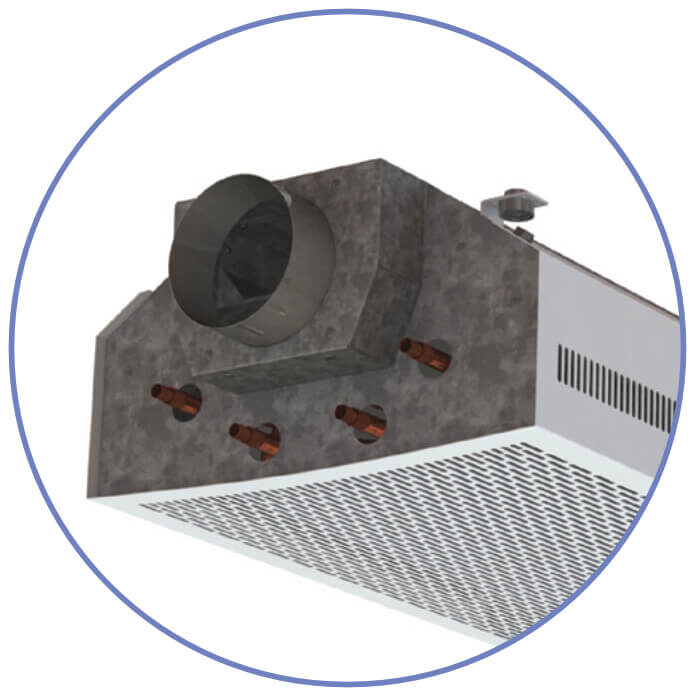 EIn aktiver Deckenkonvektor zum Heizen und Kühlen (auch als „Induktionseinheit“) kombiniert zwei zentrale Funktionen in einem Gerät: temperieren mit Wasser und Luftverteilung mit Zuluft. Er ist fest an das hydraulische Heiz- und Kühlsystem des Gebäudes angeschlossen und wird zusätzlich mit Primärluft aus einer zentralen Lüftungsanlage versorgt.